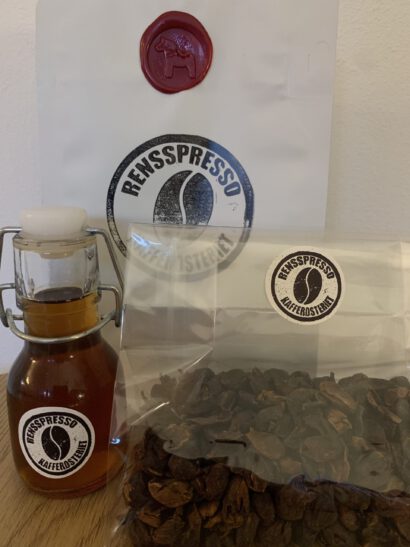 Vi erbjuder även cascara (torkade skalet från kaffebäret) och cascarasirap som vi tillverkar själva. Kolla Facebook och Instagram för at se när vi säljer kaffe på Reko!